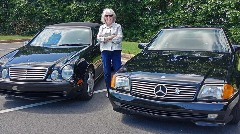 As far as Mercedes, she and her husband Ken have a 1991 500 SL, a 2015 GLK, and her dream car which she newly purchased from a club member – a 2002 CLK 55 AMG. FYI – all models are black cabriolets.